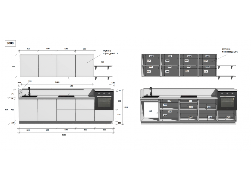 установка бытовой техники и сантехники, изготовление отверстий, выпилы и другие конструктивные корректировки, производимые на месте сборки, оплачиваются отдельно согласно прайс-листу.